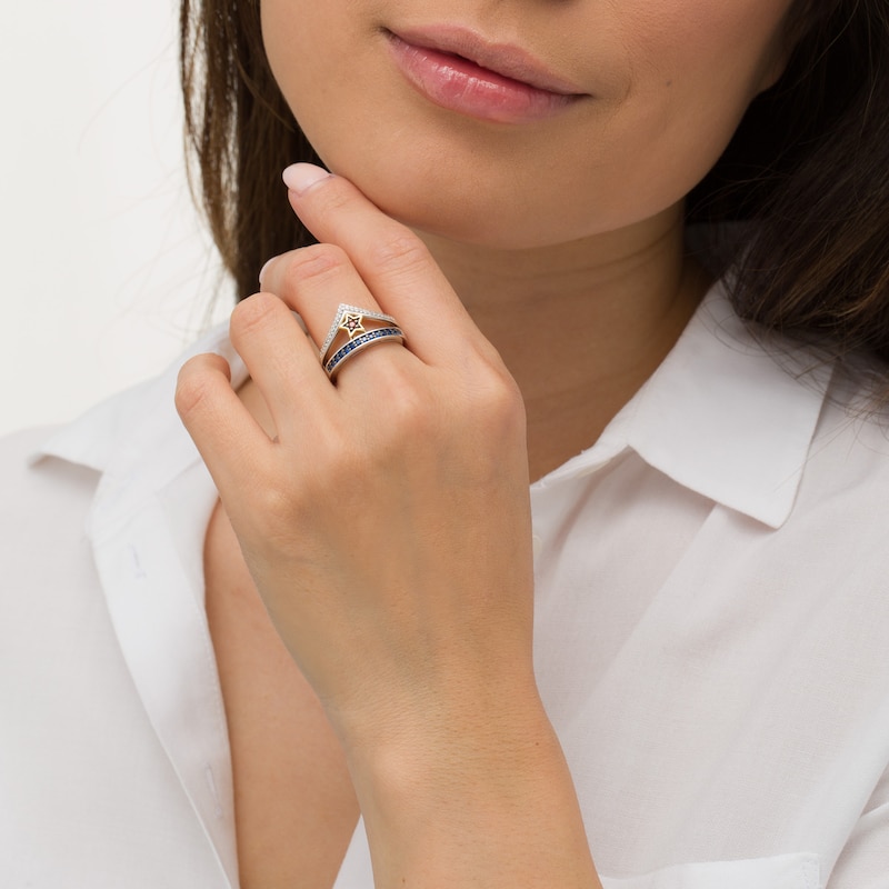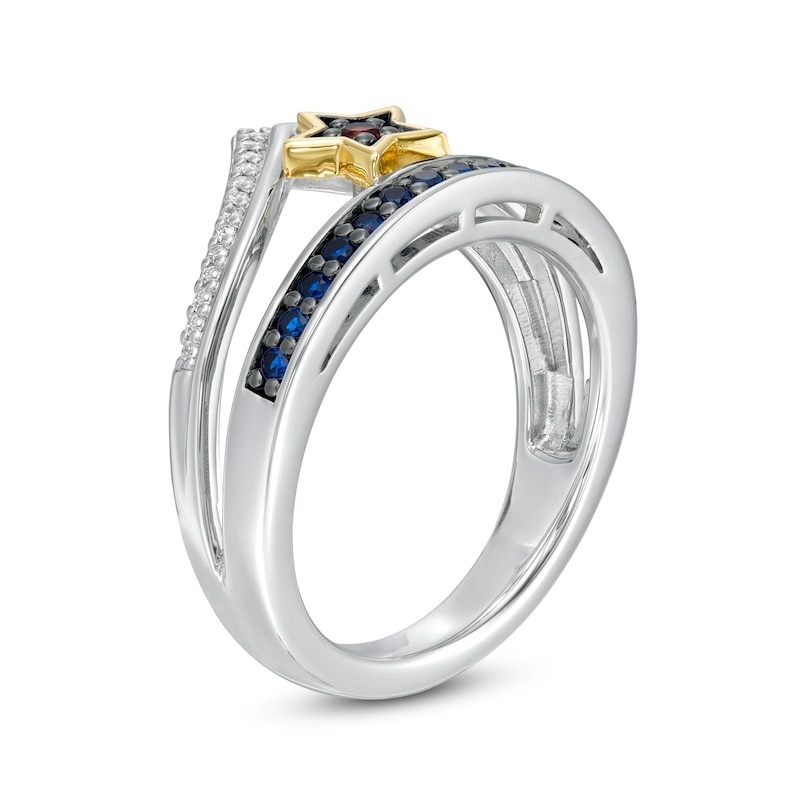 Crafted in sterling silver, this openwork style features a regal red garnet set in a 10K yellow gold star. A row of brilliant sapphires and a V-shaped diamond ribbon accentuate the center, creating a tiara-like look. Enchanting with 1/15 carat diamonds and a brilliant polish, this selection is an epic take on modern design. This ring is only available in size 7. Sterling silver rings cannot be resized after purchase.
