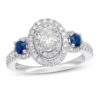 Exquisitely styled, this engagement ring features a 1/2-carat oval diamond center traced in two rows of round diamonds, and flanked on either side by round natural sapphires, symbols of purity. Additional round diamonds line the band, while princess-cut sapphires enliven each profile to complement the design. Crafted of 14K white gold, the ring has a total diamond weight of 1 carat.